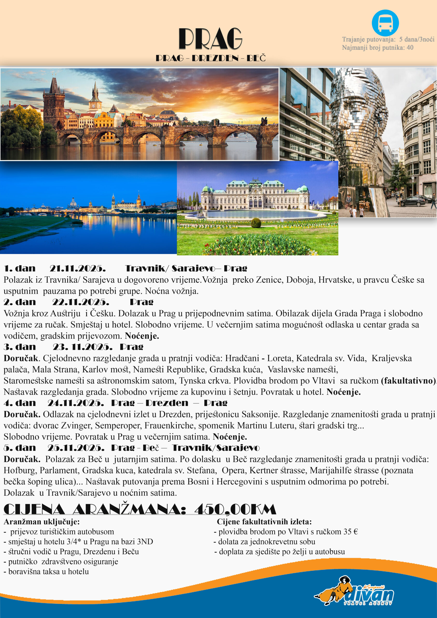 Doručak. Odlazak na cjelodnevni izlet u Drezden, prijestonicu Saksonije. Razgledanje znamenitosti grada u pratnji vodiča: dvorac Zvinger, Semperoper, Frauenkirche, spomenik Martinu Luteru, stari gradski trg… Slobodno vrijeme. Povratak u Prag u večernjim satima. Noćenje. 5. dan 25.11.2025. Prag – Beč – Travnik/Sarajevo Doručak. Polazak za Beč u jutarnjim satima. Po dolasku u Beč razgledanje znamenitosti grada u pratnji vodiča: Hofburg, Parlament, Gradska kuca, katedrala sv. Stefana, Opera, Kertner strasse, Marijahilfe strasse (poznata